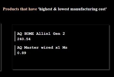 AQ Home Allin1 gen 2, with its high manufacturing cost, may indicate that it is a premium product with advanced features or uses high-quality components. On the other hand, AQ Master wired x1 Ms, with its low manufacturing cost, may suggest that it is a budget-friendly product with minimal features or uses lower-quality components.